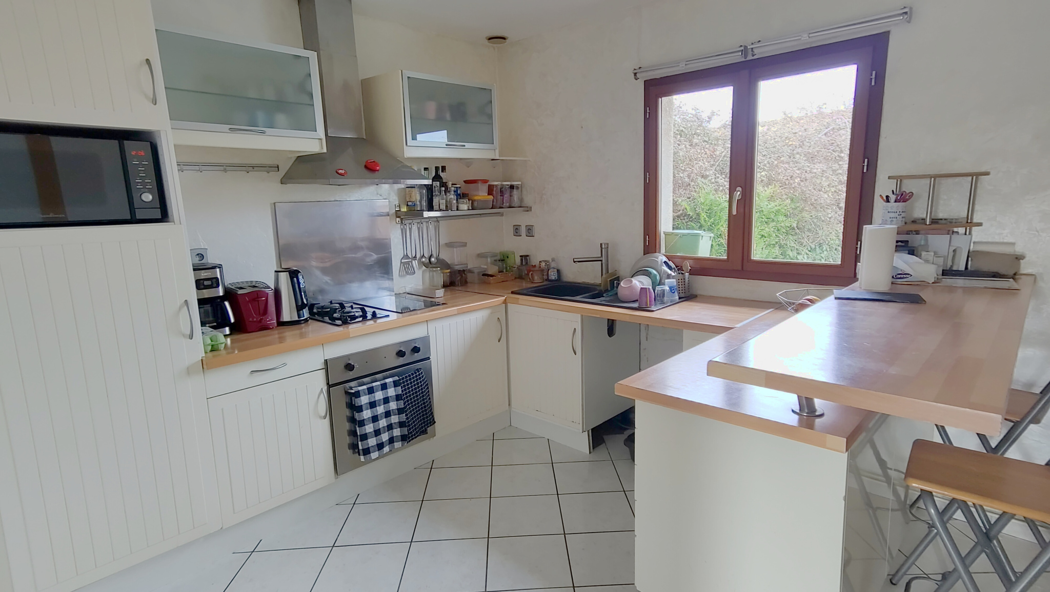 Vous profiterez d’un séjour lumineux avec cheminée à insert, ainsi que d’une cuisine séparée et équipée.
